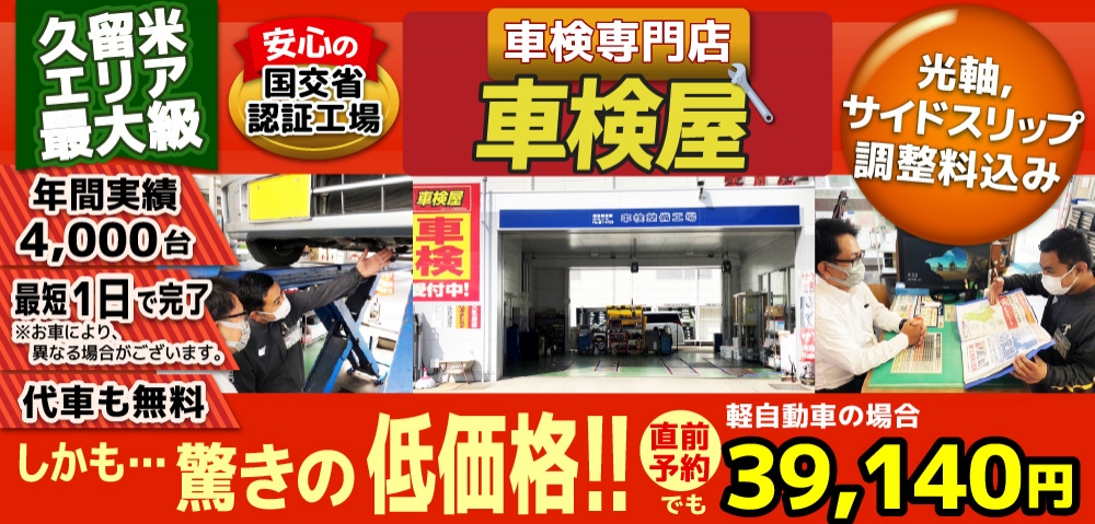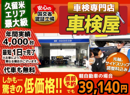 の費用がかかっていない為、その費用分を安く久留米・小郡・鳥栖・三井郡(大刀洗町)・八女郡(広川町)・朝倉郡(筑前町)エリアのお客様に車検をご提供!